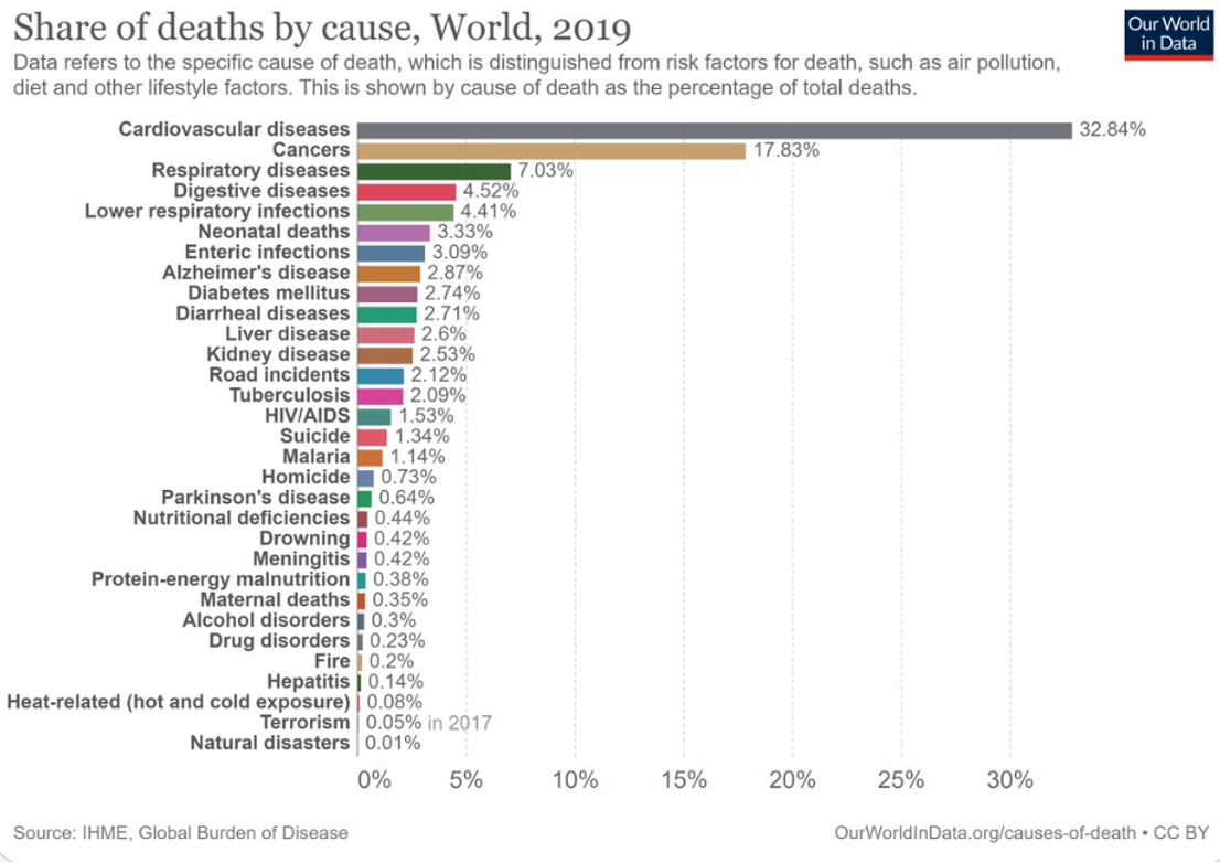 At the bottom of the chart, natural disasters, terrorism, and death from extreme heat or cold barely register. Since the study ended, the most significant deviation from the norm is COVID. It is one of the top four causes of death.